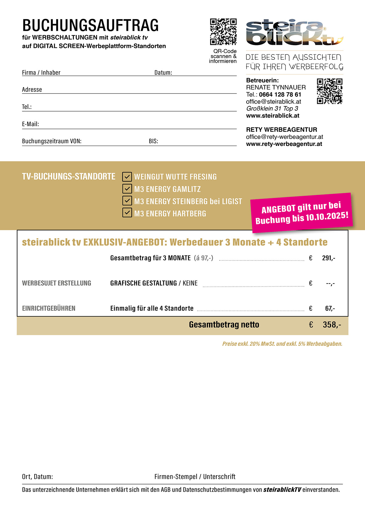 Da steirablicktv pro Standort nur begrenzte Werbeplätze vergibt, sichern Sie sich mit einer schnellen Buchung maximale Sichtbarkeit für Ihre Botschaft und garantieren sich einen entscheidenden Wettbewerbsvorteil.